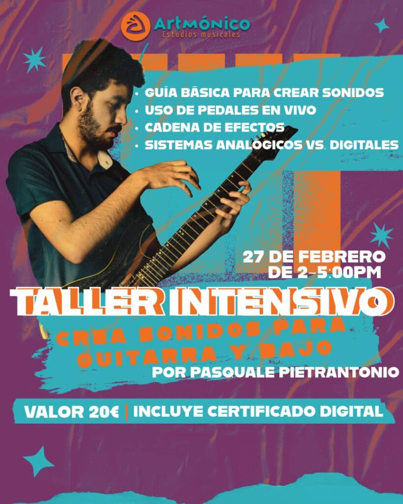 Y también para guitarristas y bajistas, el maestro, Pasquale Pietrantonio, invita a crear sonidos a través de pedales y efectos, uso de pedaleras en vivo, cadena de efectos y hará un análisis sobre los sistemas analógicos vs los digitales. Puedes traer tus pedales y efectos y en el taller aprenderás a potenciar sus sonidos. Incluye guía y certificado digital.